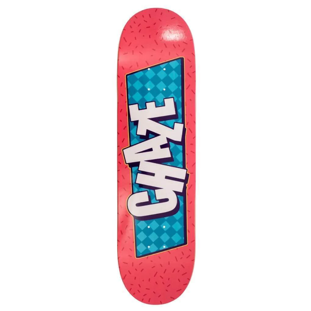 Shape Chaze, fabricado no Brasil com 7 lâminas de maple canadense leves e resistentes, colado com resina epóxi e prensados a vácuo, garantindo mais resistência, disponíveis do tamanho 7.75 ao 8.50, o concave médio oferece estabilidade e controle, e a arte feita em heat transfer proporcionando um desgaste natural.